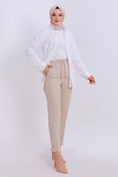 Model Details: Height: 1.75 Bust: 85 Waist: 63 Hip: 92. Fabric Details: 70% cotton 25% polyester 5% lycra Size 38 Product Information: Pants Length: 89 cm Waist Width: 64 cm Unlined. Pants with elastic waist and pocket detail. Tie detail on waist is just for accessory purpose. The product is made of lycra so there may be 4 cm difference between sizes. Size on Model: 38 The other sizes of product: 40-42-44-46-48 Made of summer cloth. Accessories are not included in price. Product colors may vary on some products due to differences in shooting light or color settings on monitor/phone screens.