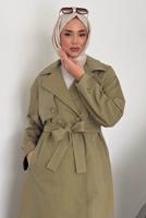 Long sleeve, unlined, double breasted, pocket detail, belted, buttoned.