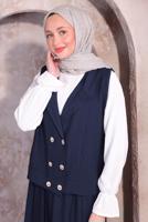 Vest: Sleeveless, unlined, double-breasted, buttoned, non-pocket detail.