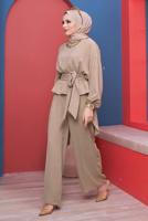 BEIGE ENSEMBLE PANTALON 2 PIÈCES AVEC CEINTURE ET CHAÎNE 73051