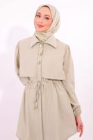 Tunique: Manches longues, non doublée, col chemise, boutonnée, détail sans poche, taille nouée, poignets élastiques.