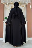 Abaya: Broderie de pierres précieuses, détail de fente, détail de fermoir, poignets à double pont.