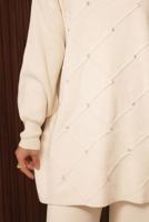 Tunik astarsız, dik yaka, cepsiz, taş baskılı, triko kumaş.