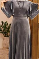 GRİ KOLLARI FIRFIRLI KADİFE ELBİSE 40001