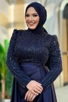 LACİVERT SATEN ABİYE ELBİSE T 4207 DETAYLARI