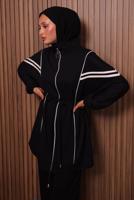 Tunik uzun kollu, astarsız, dik yaka, fermuarlı, manşetleri lastikli, beli bağcıklı.