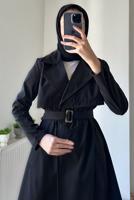 SİYAH KRUVAZE YAKA KEMERLİ TRENÇKOT T 7395 DETAYLARI