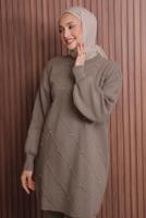Tunik astarsız, dik yaka, cepsiz, taş baskılı, triko kumaş.