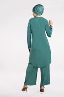 Manken Bilgileri: Boy:1.75 Göğüs:85 Bel:63 Basen:92 Kumaş Bilgileri: %74 Viskoz %23 Polyester %3 Elastan Ürün Uzunluğu: Bluz: Ön: 83 cm Arka: 105 cm Pantolon: 105 cm Ürün Astarsızdır. Manken Üzerindeki Beden: 36 bedendir.  Ürün kumaşı: Yazlık kumaştan üretilmiştir. Aksesuarlar ürüne dahil değildir.