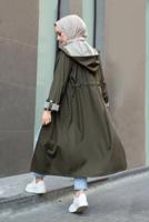 YEŞİL MANŞETLERİ DESENLİ BELİ BÜZGÜLÜ KAPÜŞONLU TRENÇKOT 17501 DETAYLARI